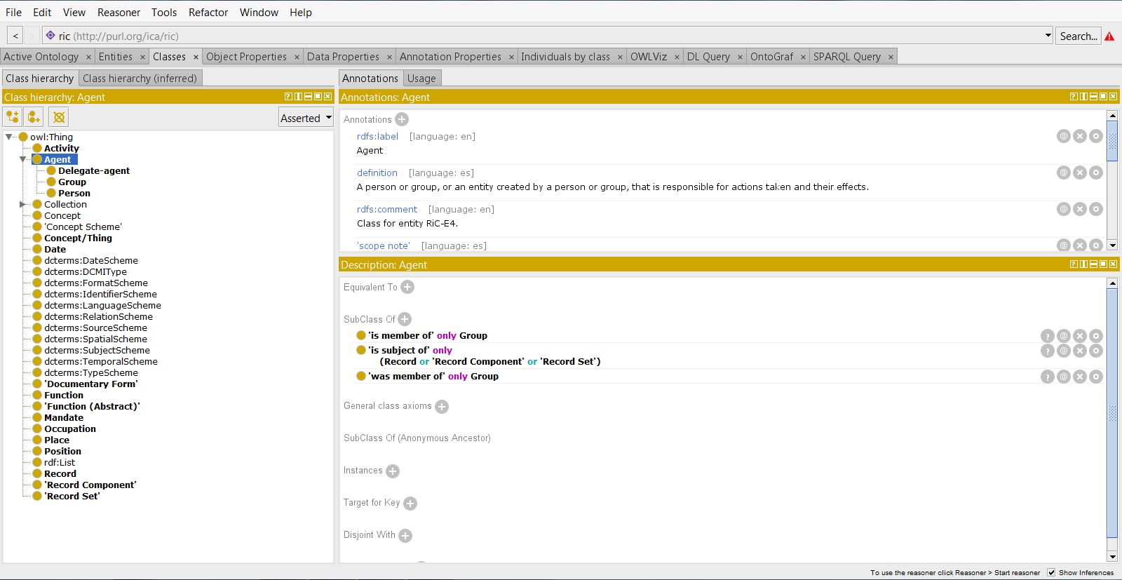 Las entidades del modelo conceptual corresponderían a las clases en la ontología. Por ejemplo, la clase agente, como se ve en la figura 9, tiene las subclases agente delegado, grupo y persona.