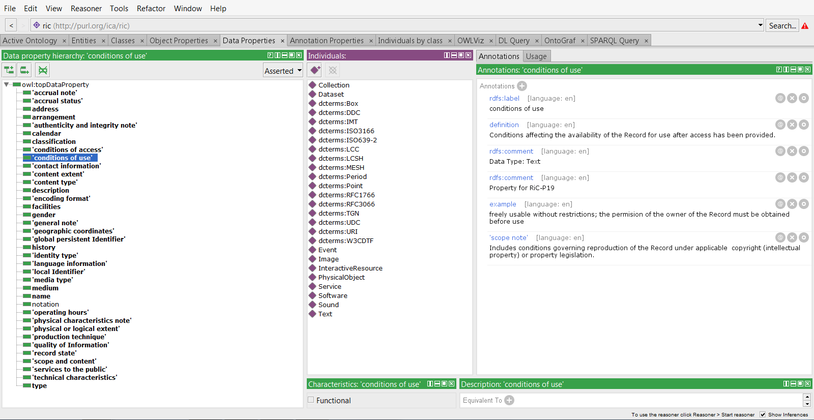 La ontología de RiC de la primera versión fue presentada, sumariamente, en el encuentro del 8 de setiembre de 2016 por Florence Clavaud, del Archivo Nacional de Francia, y se encuentra disponible en GitHub (Clavaud, 2016/2020). Se ha trabajado sobre ella, aunque está disponible, como se señaló, una versión de 2020, a los efectos de ejemplificar su utilización.