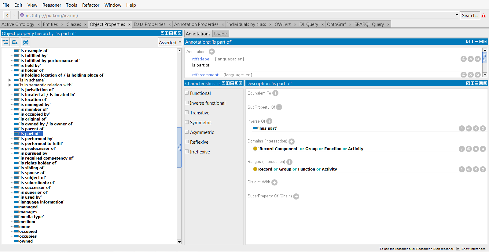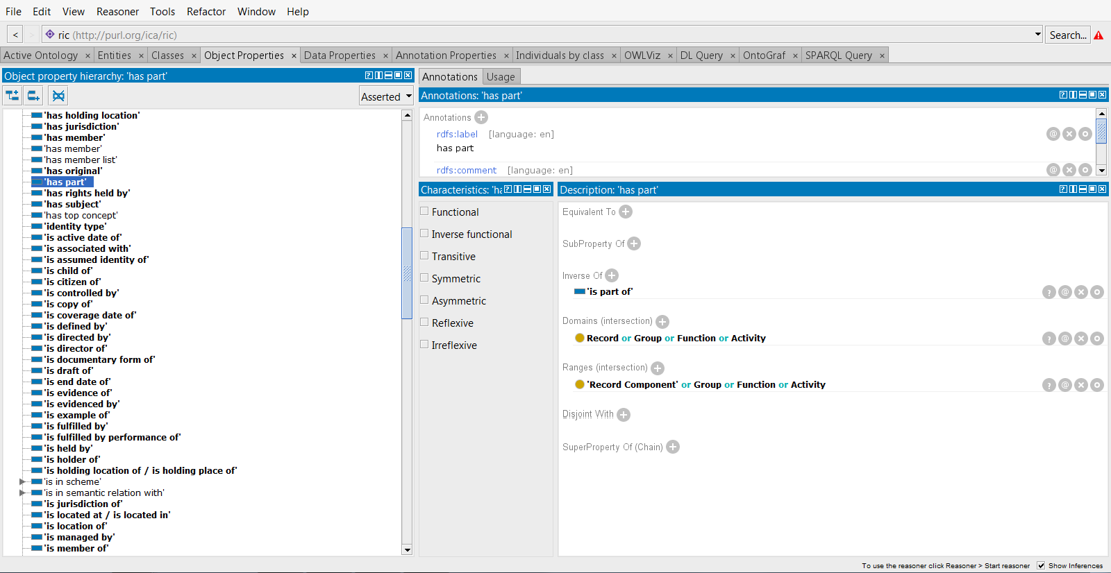 En la Figura 11 se ve la relación is part of (es parte de), que es una relación, por ejemplo, entre un componente de registro y un registro. A su vez, está la relación inversa has part of (tiene parte de), que tiene como dominio el componente de registro y, como rango, el registro, como se ve en la Figura 12.