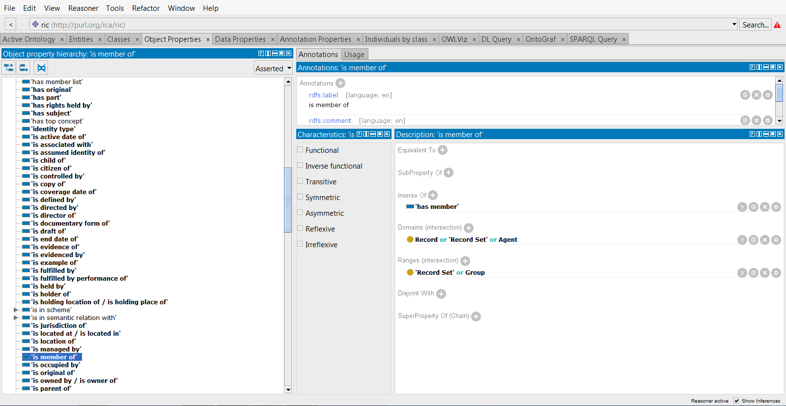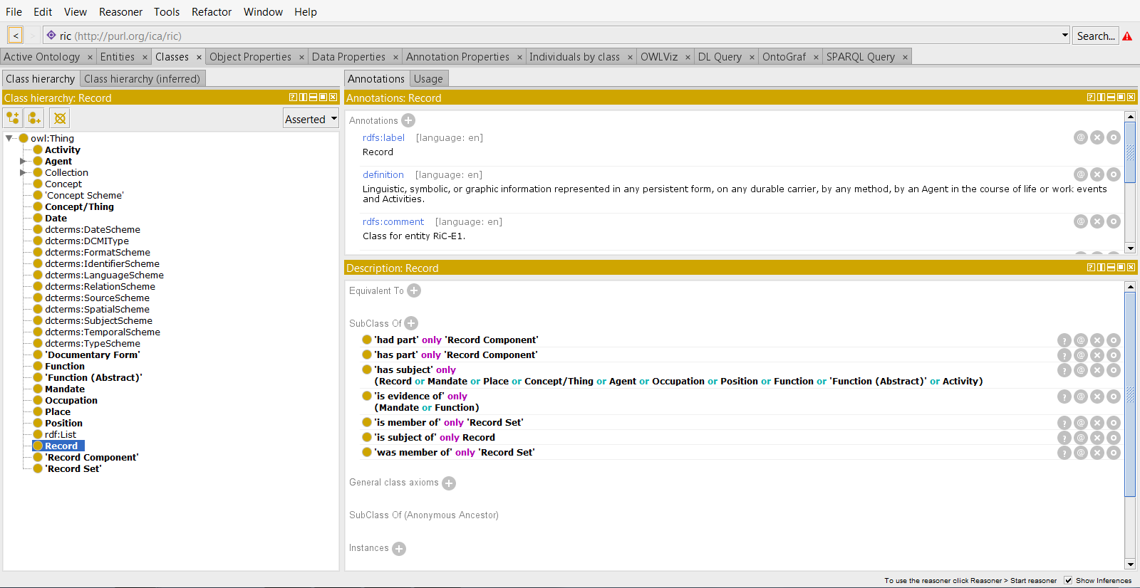 La ontología permite utilizar lógica descriptiva para realizar afirmaciones de los objetos. Por ejemplo, en el sector Description, correspondiente al registro (record) hay una línea: «has part only Record Component», que se forma diciendo algo del elemento has part (tiene parte), que es una propiedad de objeto sobre una clase Record Component (componente de registro), con un operador only. El operador only es lo que se llama una restricción universal, es decir, si algo has part (tiene parte), entonces, esa parte tiene que ser un componente de registro, como se muestra en la Figura 13.