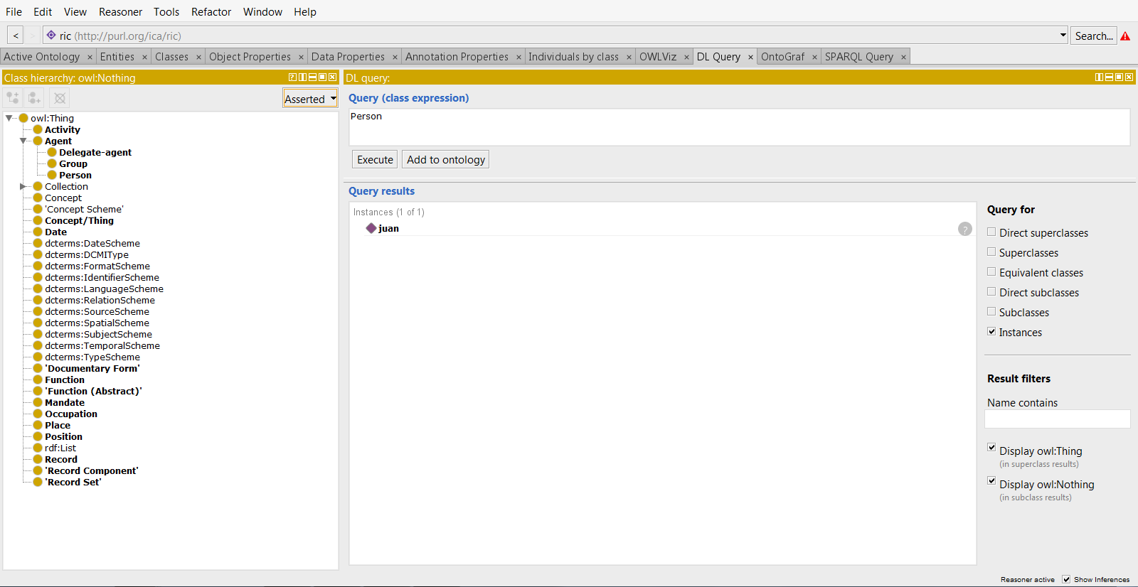 Se pueden realizar búsquedas sobre los datos a través de la pestaña DL Query, como se puede observar en la Figura 14, donde se pregunta cuáles son los individuos o las instancias de la clase person y devuelve Juan, que es el único individuo que se ingresó.