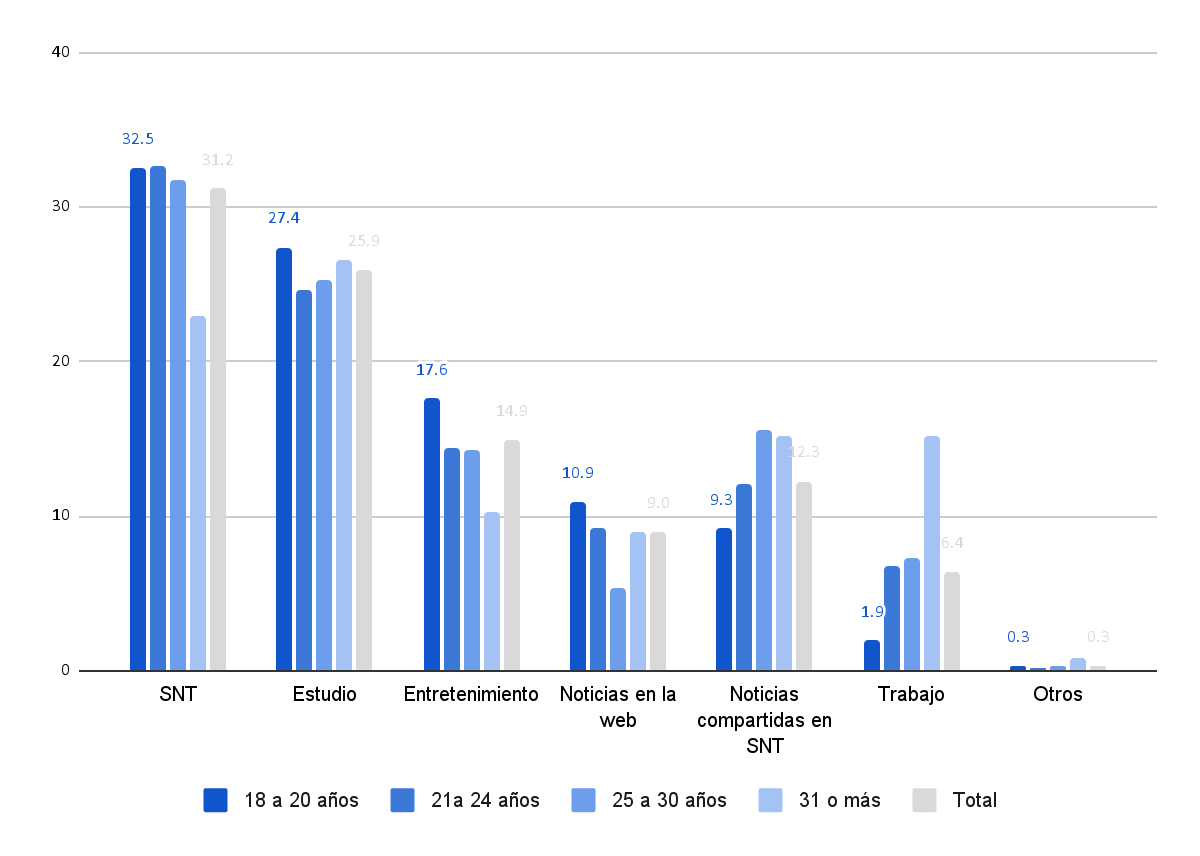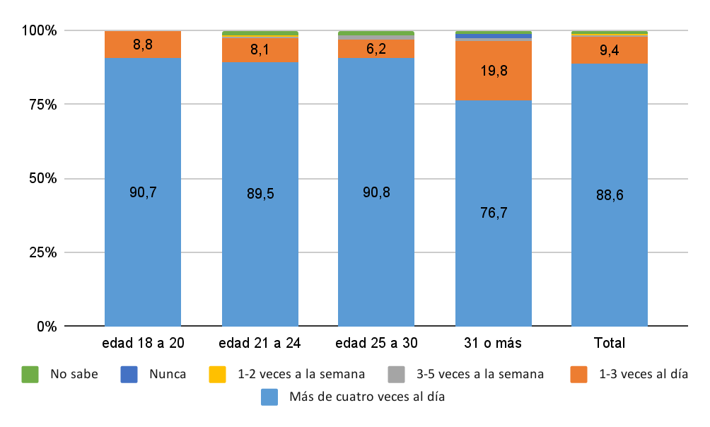 La gran mayoría (72,2 %) de los encuestados, a quienes se les pidió que marcaran hasta tres opciones sobre el uso habitual que realizaban de internet, señalaron «para estudiar» (véase figura 1); porcentaje solo superado por navegar y SNT (87,1 %). Se tomó la variable de la edad y se recodificó en tabulación cruzada con el uso habitual (fig. 2). Los datos muestran que el uso de las SNT para estudiar no varía de forma significativa según la edad (18 a 20, 21 a 24, 25 a 30, más de 31 años). La diferencia entre el uso de internet según la edad sí se observa en la búsqueda de noticias o tareas laborales (véase figura 2). Otro dato relevante es el dispositivo que utilizan los estudiantes habitualmente para conectarse a internet: smartphone (49,3 %) y computadora (43,1 %). La variable frecuencia de conexión de los estudiantes por edad (véase figura 3) tampoco arroja datos significativos.