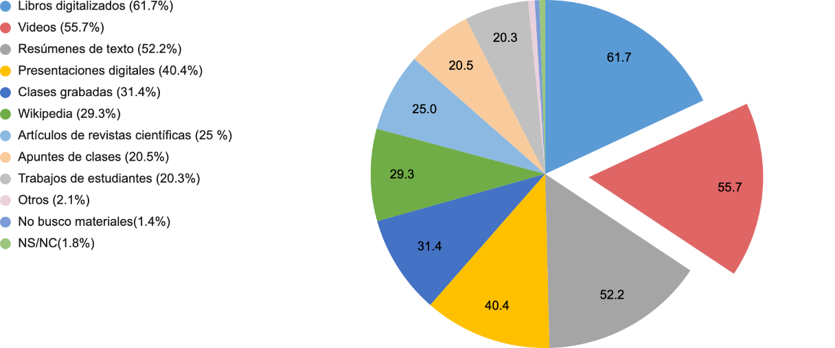 En cuanto al tipo de materiales que descargan los estudiantes de internet, sobre el total de menciones, un 61,7 % buscó libros digitalizados; el 55,7 %, videos; el 52,2 %, resúmenes, y el 40,4 %, presentaciones digitales, entre otros tipos de materiales (véase figura 4). Asimismo, se observa un alto uso de videos para estudiar.