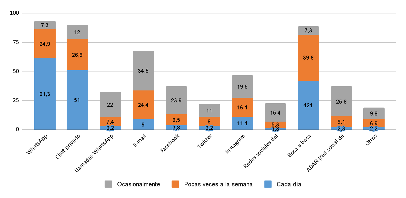 Figura 6: Frecuencia con la que comparten o se comunican entre pares según medio