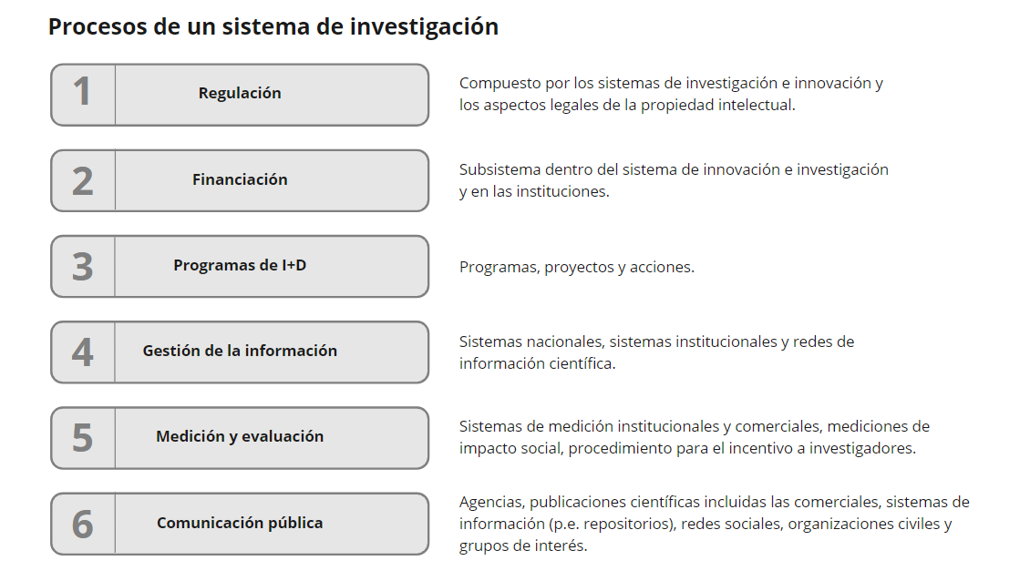 Los procesos 3 y 4 de programas de I+D+i y gestión de la información, si bien tienen una dependencia con las políticas nacionales de ciencia, están asociados de manera directa a las agencias, instituciones de investigación, los centros y las universidades.