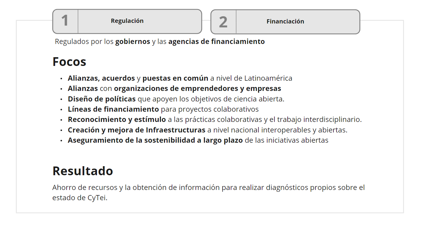 Con relación a la ciencia abierta, la diversidad en cuanto a formalización y avances en la estructuración de los organismos de ciencia, tecnología e innovación, no solo entre países, sino también al interior mismo de un país y entre disciplinas científicas crea un panorama fragmentado, detenido en las aspiraciones y con poco poder transformador.