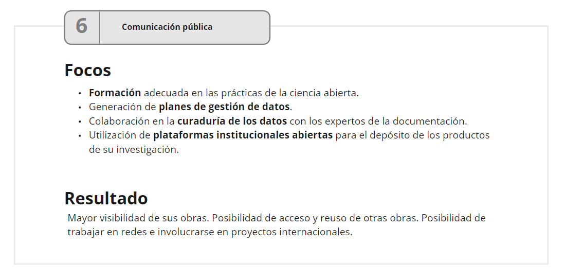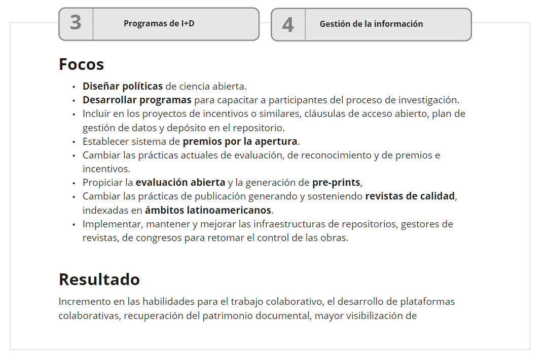 - Diseñar políticas de ciencia abierta. En este nivel, este punto es crucial para las universidades.