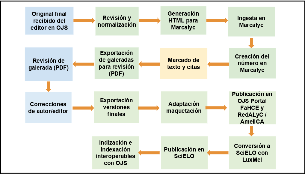 Fuente: elaboración propia. Nota: en celeste, tareas realizadas por editores; en verde, por profesionales del equipo técnico de edición; en amarillo, por bibliotecarias externas al equipo técnico.