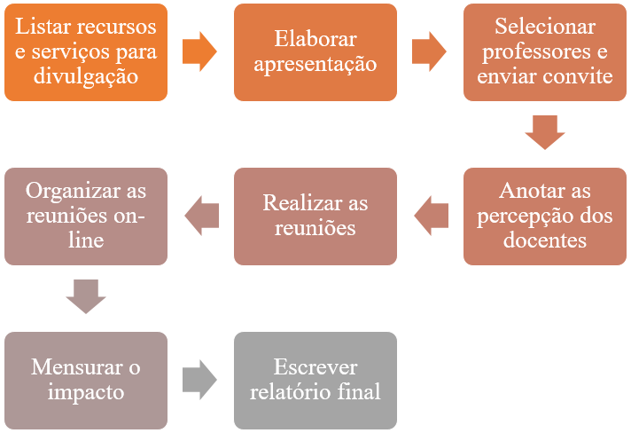 Com este conjunto de novos serviços e adaptações, percebeu-se a necessidade de restabelecer o vínculo com os professores, mesmo à distância, para que estes tivessem conhecimento das ofertas e pudessem ser disseminadores com outros públicos. A partir desta percepção, foi desenhado um projeto que pretendia apresentar aos professores esta nova fase da Biblioteca Central. O projeto foi dividido nas etapas descritas na figura 2.