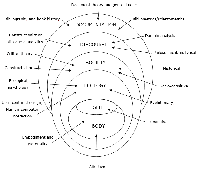 Bates (2022) models information in relation to human beings in six frameworks—the self, the thinking, motivated being, within the body, existing in a physical ecology that is shaped by society - all the social and cultural elements of human existence, discourse, and documentation, and places sixteen methodological and theoretical metatheories in relation to these frameworks. See Figure 1. Bates describes it as a simplified diagram of the various principal domains where various theoretical and methodological approaches have concentrated their attention on considering the role of information in human life. Bates says that the display is approximate, with information being the unique core of our field, that could be studied from many directions and perspectives. Using any one of the metatheories, a researcher will be able to trace the role or impact of information in human life and institutions from the perspective of that metatheory (Bates, 2022).