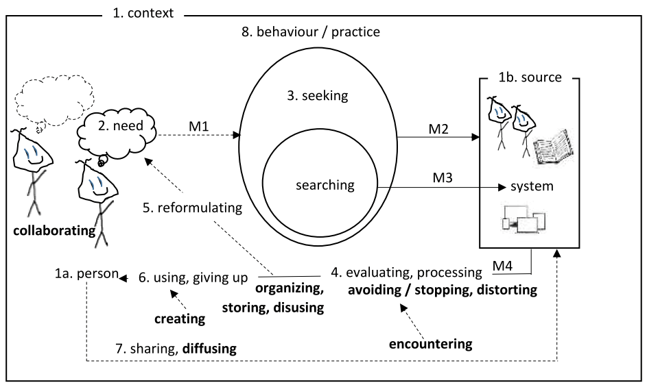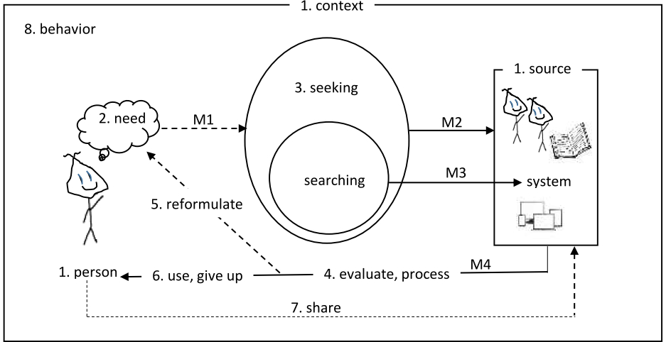 The model shows a person or a user (labeled 1 in the figure) who engages in a seeking (3) or searching task from various information sources (1) when confronted with a need (2) for information that arises in a certain work or everyday life context (1). The person evaluates and processes (4) the information received and reformulates (5) the query to help answer more questions that arise. At some point, the person may decide to give up (6) searching for more information, and use (6) or share (7) the information that is retrieved. The various steps in this information behavior may be affected by a series of moderators labeled M1, M2, M3, and M4 in Figure 2.