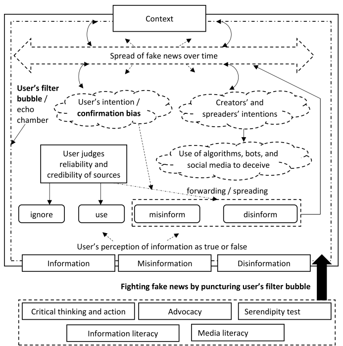 Figure 15 shows Agarwal & Alsaeedi (2021)’s disinformation behavior framework on the fake news phenomenon and ways to fight it. Misinformation is false information while disinformation is intentially false information. When applied to news, the phenomenon is termed fake news. As per the framework, all false information arises within a certain context such as national elections, COVID-19 pandemic, etc., where, depending upon the intentions of creators and spreaders of false information, algorithms, bots, and social media can be used to deceive. Fake news spreads over time, aided by those who create and spread it, with the intention of influencing outcomes or changing historical narratives. The person or user, as a consumer of information, and depending on their judgement of the credibility and reliability of information and sources (where such judgment is, in turn, affected by one’s confirmation biases and propensity to believe in false narratives) might decide to use, ignore, forward or spread this (mis/dis)information. All this happens within a filter bubble or an echo chamber that the user resides in, where their sources of information such as social media contacts or news media they consume, might further reinforce the user’s biases. The framework proposes ways to fight false information through advococy, critical thinking and action, information/media literacy, and tests for serendipity to determine if the information encountered is truly serendipitous or planted for the user to consume. These methods would help in puncturing the user’s filter bubble.