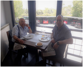 Luego de almorzar muy agradablemente (momento del que la foto que acompaña a este texto deja constancia pese a su pobre calidad estética, de la que me hago responsable) llegó la hora de devolverme al domicilio puntual que tuve por aquellos días en Aravaca, un arbolado y tranquilo suburbio madrileño, en la puerta misma del Parque Casa de Campo. Contra todo pronóstico llegó a “cabrearse” mucho porque, en el laberinto de un trébol de carreteras, nos perdimos varias veces como dos niños, ¡¡usando GPS!!