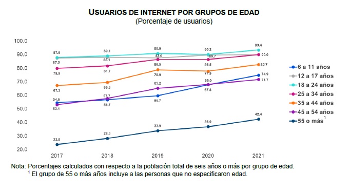 Datos a nivel de la población mundial establecen que el 32,1 % no utiliza internet (Internet World Stats, 2023); específicamente en México, menos del 50 % de adultos en edades de 55 años o más no hacen uso de esta herramienta. Cabe mencionar que a mayor edad menor posibilidad o interés por utilizarla (Instituto Nacional de Estadística y Geografía, 2022). Cifras publicadas por esta institución revelan que «el menor uso de internet se registró en las personas de 55 y más años, con una participación de 42,4 por ciento» (Instituto Nacional de Estadística y Geografía, 2022).
