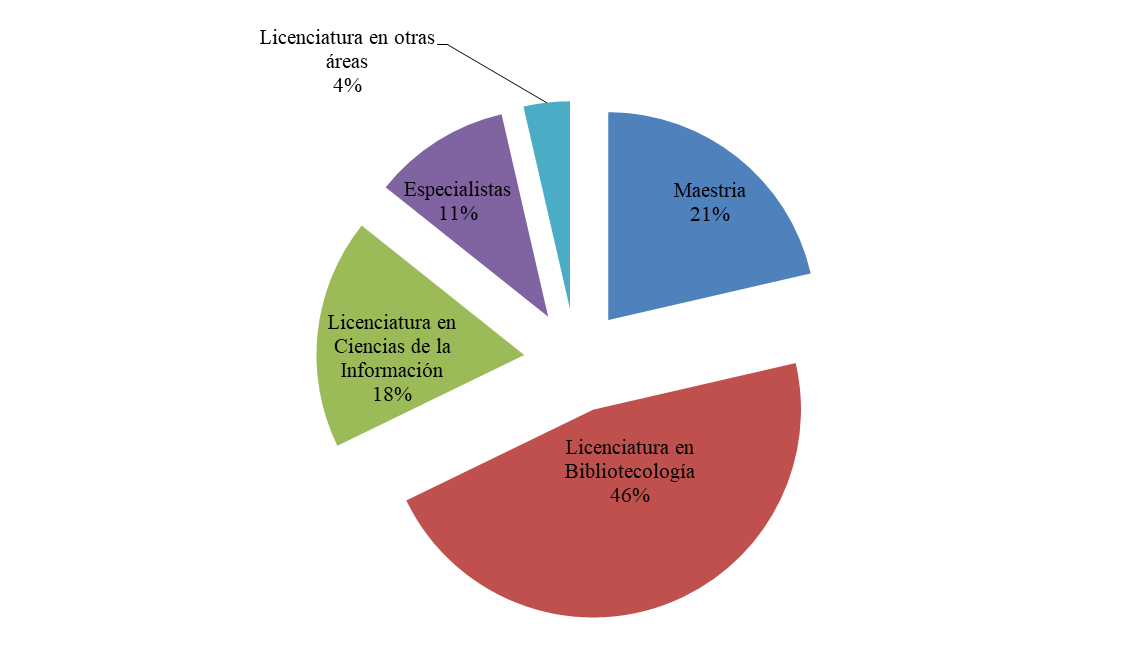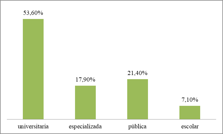 Para esta investigación respondieron el formulario un total 28 encuestados, lo que permitió conocer primeramente su grado académico. Los resultados obtenidos se muestran en el gráfico 1. En él se observa que entre los responsables de bibliotecas o centros de información hay un predominio de profesionales graduados en la Licenciatura en Bibliotecología (46,4 %).